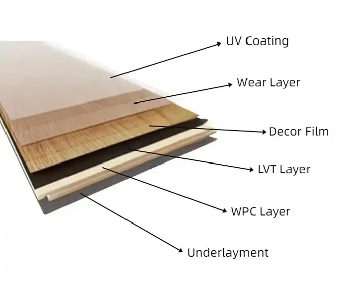 Wood Plastic Composite (WPC) flooring combines vinyl flooring technology with a foamed composite core to provide a softer, more comfortable feel underfoot. This structure offers improved sound insulation and cushioning while maintaining excellent moisture resistance and structural stability. WPC is particularly well-suited for residential homes, hospitality settings, and spaces where comfort and acoustic performance are priorities, offering a perfect blend of comfort, durability, and visual appeal.
